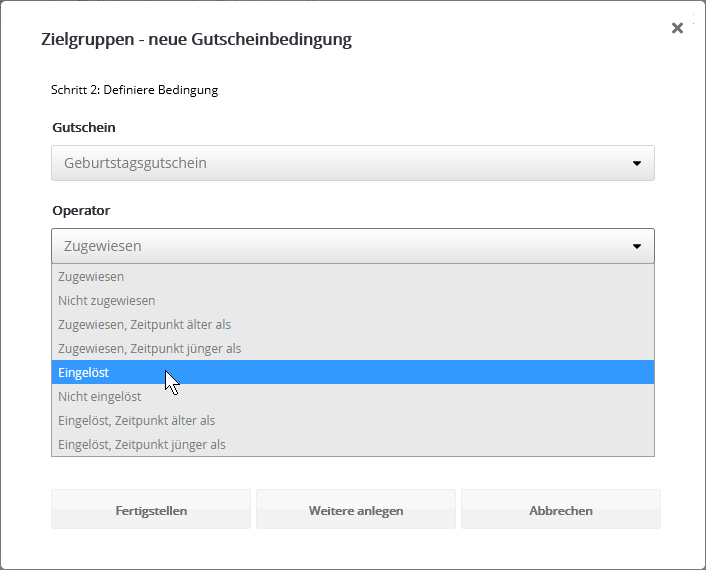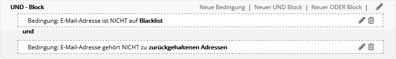 Insbesondere nach dem Kopieren einer vorhandenen Zielgruppe kann das sinnvoll sein, wenn die identischen Abonnenten in Original und Kopie nicht gewünscht sind. Bedingung anhand GutscheinFiltern Sie Abonnenten danach, ob und in welchem Zeitraum die Zuweisung oder Einlösung eines Gutscheins stattfand. Tipp: Um zugewiesene Gutscheine als eingelöst zu markieren, nutzen Sie entweder die Webservice-Funktion 'RedeemVoucherByCode' oder importieren in der Gutscheinübersicht eine CSV-Datei mit den eingelösten Gutscheincodes. Bedingung anhand SelektionMit diesem Bedingungstyp nutzen Sie eine per Webservice angelegte Selektion von Abonnenten als Mediatack-Zielgruppe. Der Bedingungstyp ist nur dann sichtbar, wenn per Webservice mindestens eine Selektion angelegt wurde. Das Besondere: In einer Selektion werden Abonnenten anhand einer Liste von IDs gruppiert. So lässt sich eine extern getroffene Abonnentenauswahl als Zielgruppe nutzen, ohne dass in den Mediatack-Abonnentendaten ein gemeinsames Merkmal vorliegen muss. Die Details entnehmen Sie bitte der Webservice-Dokumentation, die wir Ihnen gern zusenden. Bedingung anhand des Empfängers (geplant)Diese Bedingung entscheidet, ob ein Abonnent als Empfänger eines bestimmten Mailings vorgesehen war oder nicht. Das bedeutet, dass er in einer Abonnentenliste bzw. Zielgruppe für ein bestimmtes Mailing steht, welches versandt wurde. Im Unterschied zur letztgenannten Bedingung wird der tatsächliche Empfang jedoch nicht geprüft. Es sind auch alle Empfänger enthalten, die das Mailing z. B. aufgrund von Bounces, Blacklists oder serversseitigen Spamfiltern nicht empfangen haben. Bedingung anhand des Empfangens (zugestellt)Diese Bedingung entscheidet, ob jemand ein bestimmtes Mailing empfangen hat oder nicht. Das Mailing gilt als empfangen, wenn der E-Mail-Server des Abonnenten eine positive Rückmeldung erteilt hat. Im Schritt nach dem Empfang ist es dennoch möglich, dass das Mailing beim Empfänger in einem Spamordner landet. Bedingung anhand des BounceverhaltensDamit legen Sie Bedingungen anhand der Zustellungen oder Nichtzustellungen eines bestimmten Mailings an. Bedingung anhand Blacklist bzw. Zurückgehaltener AdressenAbonnenten, deren E-Mail-Adresse auf einer Blacklist oder der Liste der zurückgehaltenen Adressen steht, werden automatisch vom Versand ausgeschlossen. Dieselben* Abonnenten lassen sich per Zielgruppe filtern, etwa um sie beim Export Ihrer Abonnentendaten ebenfalls auszuschließen. Die kombinierte Zielgruppe sieht wie folgt aus: