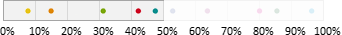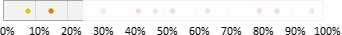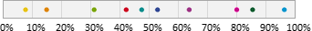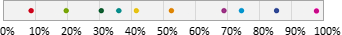 Auswahl-Wahrscheinlichkeit in ProzentGeben Sie einen Prozentwert zwischen 0 und 100% ein. Mit dieser Wahrscheinlichkeit gehört ein Abonnent zur Zielgruppe. Beispielsweise bewirkt ein Wert von 25%, dass ungefähr (siehe Hinweis) ein Viertel aller Abonnenten zur Zielgruppe gehören. Dazu verteilt Mediatack alle Abonnenten auf einem Zahlenstrahl zwischen 0 und 100%. Bei 10 "bunten" Abonnenten könnte eine Variante so aussehen: