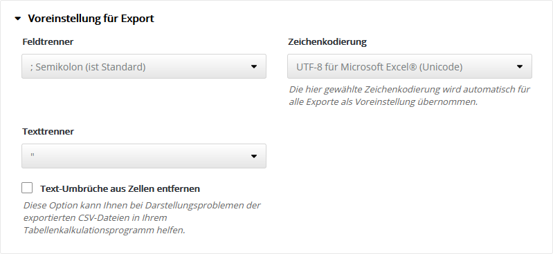Folgende 'HTML-Editoren' sind in Mediatack integriert und nutzbar: Grundeinstellung ExportHier legen Sie die Voreinstellung für den Export von CSV-Dateien fest, z. B. für den Export von Abonnentendaten. Bei der Durchführung jedes Exportes können Sie bei Bedarf auch eine abweichende Einstellung wählen. Standardeinstellung ist die Option 'UTF-8 für Microsoft Excel® (Unicode)', technisch gesprochen 'UTF-8 mit BOM'. Dieses Format wird von den meisten Officeanwendungen automatisch erkannt, so dass Umlaute und Sonderzeichen ohne manuelle Formatwahl korrekt importiert werden. StatistikeinstellungenTragen Sie Ihre eigenen Maximalwerte ein, um die rot|gelb|grün Farb-Umschaltung der Statistik-Anzeige für Öffungsrate, Klickrate und Bouncerate an die typischen Werte Ihrer Mailings anzupassen. Nur Ihre besten Mailings sollten den grünen Bereich erreichen. Die Farb-Umschaltung erfolgt automatisch in Drittel-Stufen des eingetragenen Maximalwertes. Empfehlung: Notieren Sie aus der Statistik Ihrer bisherigen Mailings die Durchschnittswerte für Öffnungsrate, Klickrate und Bounces. Damit dieser Durchschnittswert zukünftig im mittleren Drittel der Skala landet, tragen Sie das Doppelte dieses Wertes als Maximum in das jeweilige Feld ein. Tragen Sie z. B. 30% als Maximum ein, dann werden anschließend die Werte bis 10% rot, bis 20% gelb und darüberliegende Werte grün gefärbt. Sie sehen sofort, ob Ihr aktuelles Mailing über- oder unterdurchschnittlich abschneidet. Typische Durchschnittswerte:
