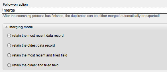 Under 'Follow-on Action' you may either choose between 'Merge' or 'Export'. In the case you did not choose any follow-on action, you will first get to the search results page and then you can decide how to continue. 'Export' creates a CSV file, which you can save on your computer and edit manually. 'Merge' merges the data records according to the selected options. The 'Merging Options' are the following: