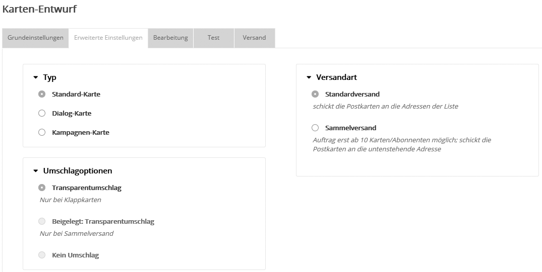 In den folgenden Einstellungen legen Sie fest, welches Postkartenformat und welche Versandart  Sie verwenden möchten.