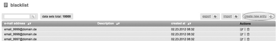 You create a blacklist (also called Robinson list) in order to restrict email addresses from registering in you subscriber list. If a person tries to sign up for one of your subscriber lists, but has an email address that is registered in your blacklist, he will not notice the exclusion. Those addresses, however, which are already signed up for a subscriber list, will be excluded from dispatch directly after having been registered in the blacklist. Therefore, these subscribers will not receive any of your mailings anymore.