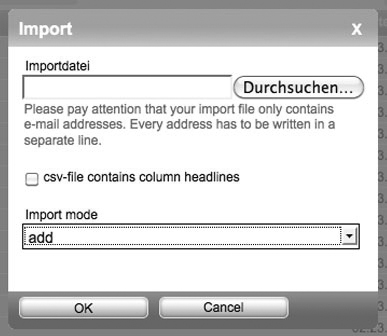 For this, you only have to choose the file from your computer, which is supposed to be imported. If this file contains column headings, mark the respective option. Then, you will only have to determine the type of import, 'Add' or 'Replace', and click on the 'OK' button. 'Replace' will delete the existing blacklist entries; 'Add' will copy new entries independently from those who are already registered in the list.