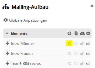 Rechts und links neben dem Mailing-Entwurf lassen sich 3 Panels aufklappen. Das Panel 'Mailing-Aufbau' können Sie wahlweise auf der linken oder rechten Bildschirmseite platzieren, umschaltbar über das 2. Symbol oben in der Werkzeugleiste. Mailing-AufbauHier wird der aktuelle Aufbau Ihres Mailings als Elementbaum dargestellt. Diese Ansicht ist besonders für die Arbeit mit komplexeren Mailings hilfreich. In der obersten Ebene des Elementbaums werden Container (dunkle Hintergrundfarbe) angezeigt. Diese geben dabei das Grundgerüst des Mailings vor. Die Reihenfolge von Containern kann nicht verändert werden. Jeder Container kann sowohl Elemente (helle Hintergrundfarbe), als auch weitere Unter-Container enthalten. Die Elemente sind dabei die sichtbaren Bestandteile des Mailings wie Artikel, Bilder und Texte. Die Reihenfolge von Elementen können Sie per Drag&Drop Ihren Wünschen gemäß anpassen. Welche Container und Elemente in einem Mailing zur Verfügung stehen, wird dabei durch das gewählte Mailing-Template festgelegt.