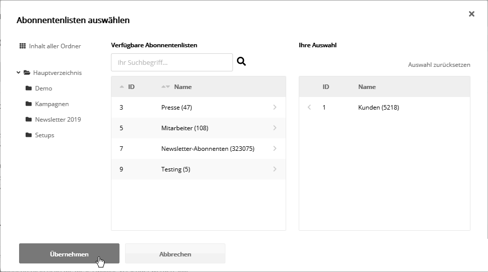 Empfänger wählen: Abonnentenlisten und ZielgruppeWählen Sie eine oder mehrere Abonnentenlisten, an die Sie das Mailing versenden möchten. Optional können Sie den Empfängerkreis zusätzlich eingrenzen, indem Sie eine oder mehrere Zielgruppen wählen. Sind mehrere Zielgruppen gewählt, werden diese gemeinsam angeschrieben. Der Beispiel-Screenshot zeigt die Wahl von Abonnentenlisten. Um eine Liste zu wählen, klicken Sie auf den Namen der Liste. Um mehrere Listen zu wählen, ziehen Sie die Maus über die gewünschten Listen nach unten. Beim Loslassen der Maustaste wird Ihre Auswahl übernommen. Nutzen Sie das Suchfeld, um nach einem bestimmten Listen-Namen oder einer Listen-ID zu suchen. Erweitert: Drosselung der Versandgeschwindigkeit und Beschränkung der Versandmenge (optional)Im Bereich 'Erweitert' lässt sich die Versandgeschwindigkeit drosseln oder die Versandmenge beschränken.