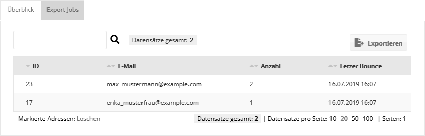 Reiter 'Überblick'Hier werden alle E-Mail-Adressen aufgelistet, deren Versendungen aufgrund von drei aufeinanderfolgenden Hardbounces zurückgehalten werden. Diese Adressen werden auf der Mediatack-internen 'Retained List' gesammelt. Verwaltet werden hier ausschließlich die reinen E-Mail-Adressen, unabhängig von den dazugehörenden (eventuell ehemaligen) Abonnenten. Oben rechts können Sie mit Klick auf den 'Exportieren'-Button die zurückgehaltenen E-Mail-Adressen als CSV-Datei exportieren. Die erzeugte CSV-Datei lässt sich anschließend auf dem Reiter 'Export-Jobs' herunterladen.