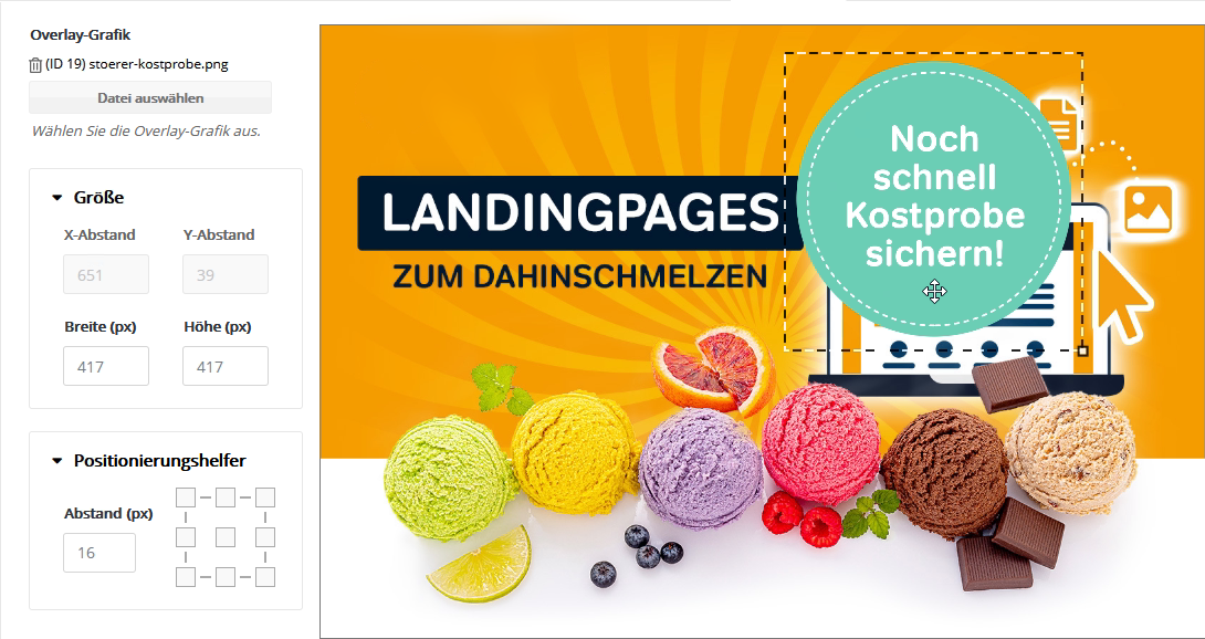 Auf diesem Reiter können Sie eine Grafik über ein oder mehrere Bilder legen, etwa ein "Neu"-Label oder den Play-Button eines Video-Vorschaubildes.